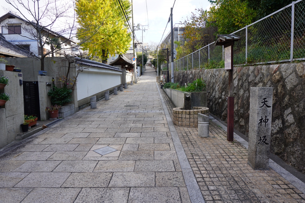 天神坂は、天王寺七坂の一つ。名前は、菅原道真を祀る安居神社へ通じる坂道だから。