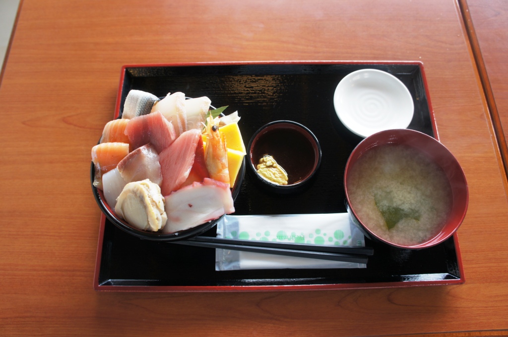 東日本大震災で壊滅的な打撃を受け、2012年夏に建て替え再オープンした道の駅よつくら港。2階部分はフードコートになってました。あまりお腹はすいてなかったけど、そのうちの「魚処 和」のメニューを見て思わず海鮮丼を注文しちゃいました。こういう場所だとホントにすごい盛り方になるから。実際に受け取ってみると、そうでした。ご飯に載った刺身の大きいこと。それもとっても新鮮なのです。期待通りでした。ちょっとご飯は多い感じもしたけど、コメどころ福島だから当然かな。福島の食べものに色んなことを言う人がいるけど、はっきり言ってもはや私には関係ありませんしね。