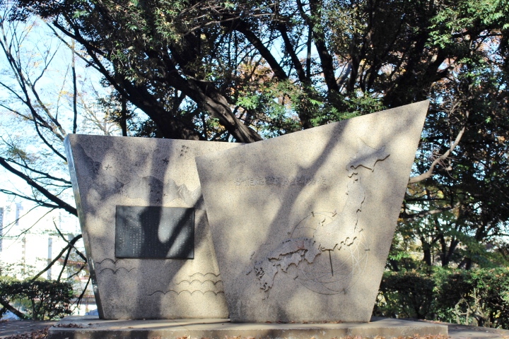 伊能忠敬測地遺功表は芝公園1号地内にある丸山古墳の頂上にあります。伊能忠敬の測量の起点となったのが、芝公園の近くであったことからこちらに建立されたそうです。でもなぜ古墳の上に建てたか疑問が残ります。遺功表には測量に因んで日本地図が彫られています。