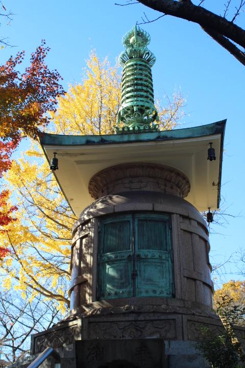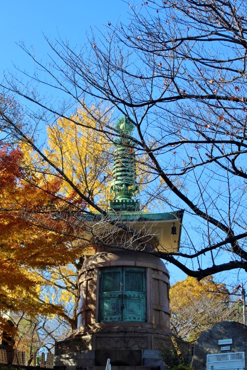 増上寺の大納骨堂は大殿の裏手の橋を渡った奥の階段の上にひっそりとあります。東京大空襲でほとんど焼失した中で、難を逃れた数少ない建造物のひとつです。増上寺に有縁無縁の骨が収められています。紅葉の時期に行きましたが、周りの木々も色付いていました。