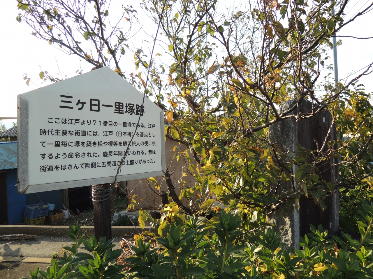 街道をしばらく東に向かって歩くとフードセンターはなしょうを通り過ぎて少し行ったコーナーのところに三ヶ日一里塚の碑があります。当時は街道の両サイドに旅人の目印になる土盛りがあったそうですが、今は看板と石碑がのこるのみで見所はないです。
