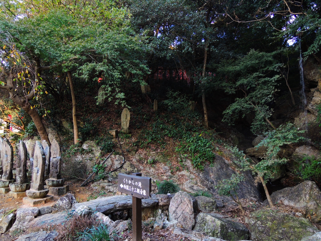 そして何よりも昭和20年代に瓦製五重の塔高さ2メートル余が発掘されたことでも有名です。現在その実物は奈良博物館に陳列されているそうです。境内は広く、小さなくりからの滝というがあります。そのよこに観音様の石像が多数並んでいる姿もお寺らしくてよかったところです。