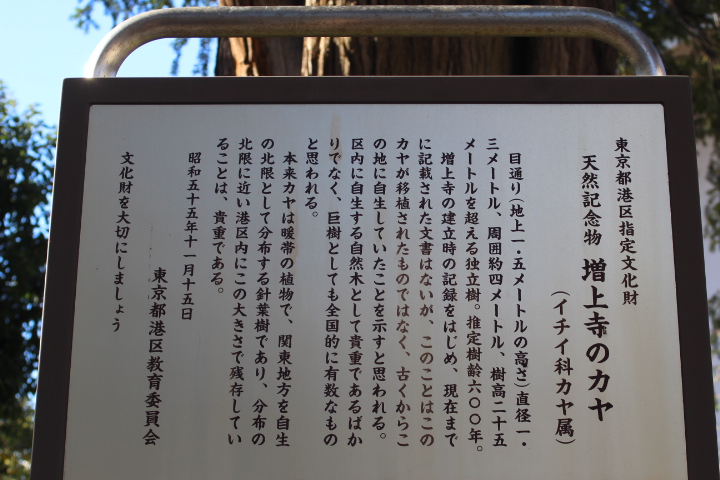 増上寺のカヤは境内の南の端にあり、近くに経蔵があります。樹齢600年と言われており、植樹したものではなくこの地に自生していたもののようです。今回増上寺を隅々見て回ったので気付きましたが、案内板がないと見落としてしまいそうです。