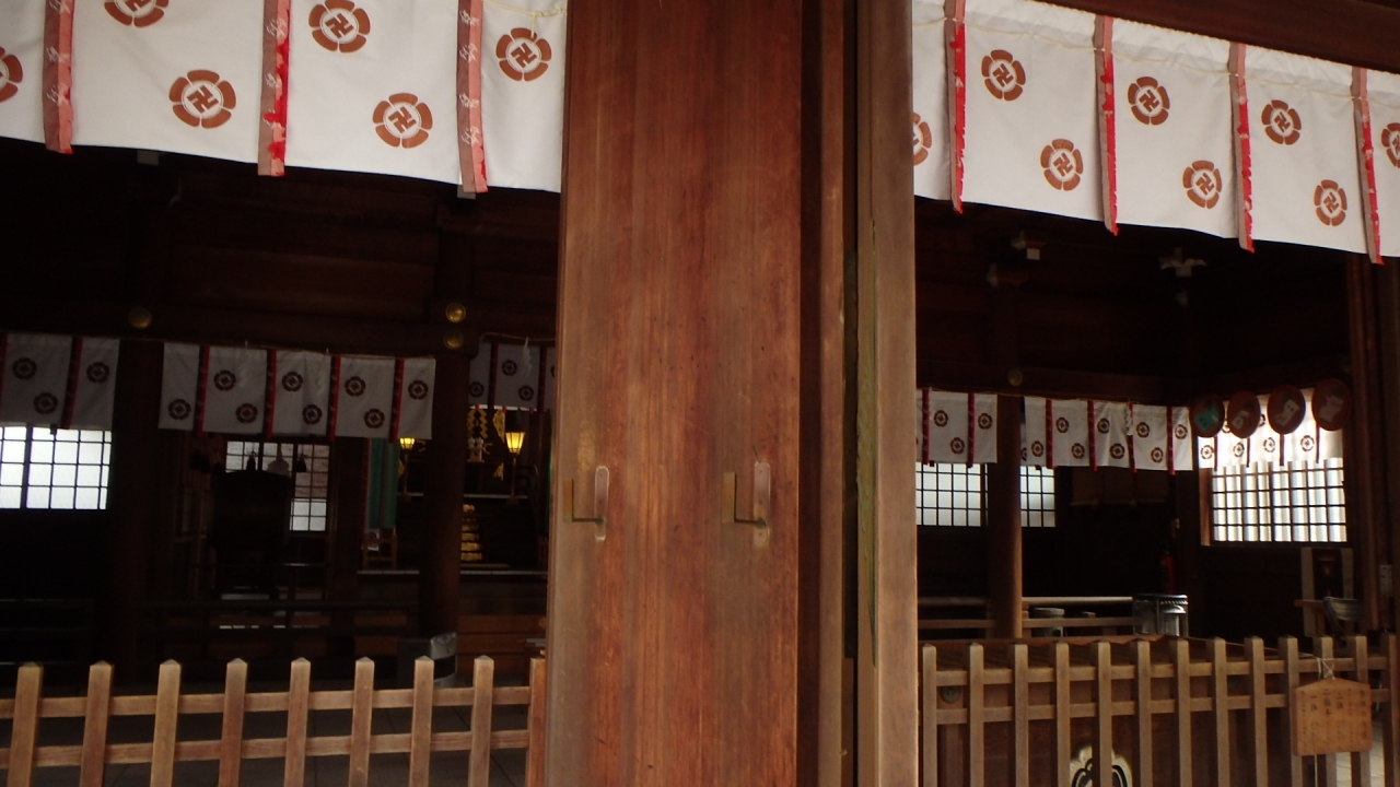 松陰神社の紋(写真上)は、吉田松陰の家紋である「五瓜に左万字」となっています。これはハーケンクロイツに似ていますが、時代からみてももっと古くからある紋章です。