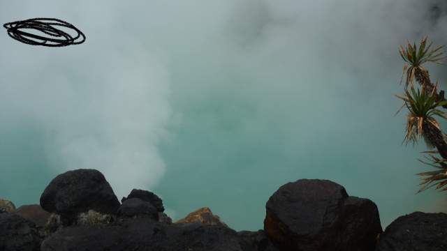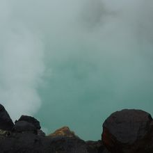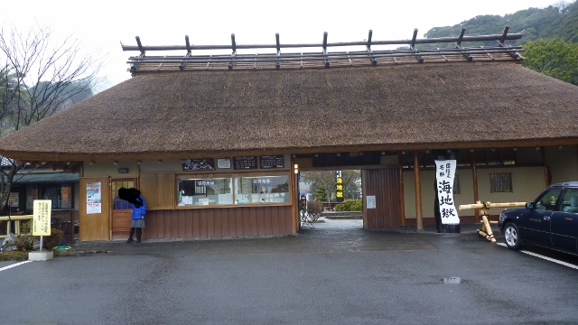 海地獄は別府地獄組合加入の地獄の一つ。血の池地獄が赤色だったのとは対照的な水色の池を見ることができる。一見涼しげな色をしているが、この日は雨と寒かったこともあり黙々と湯気が上がっている。湯温は98度とのことで触れたらやけどしてしまう。