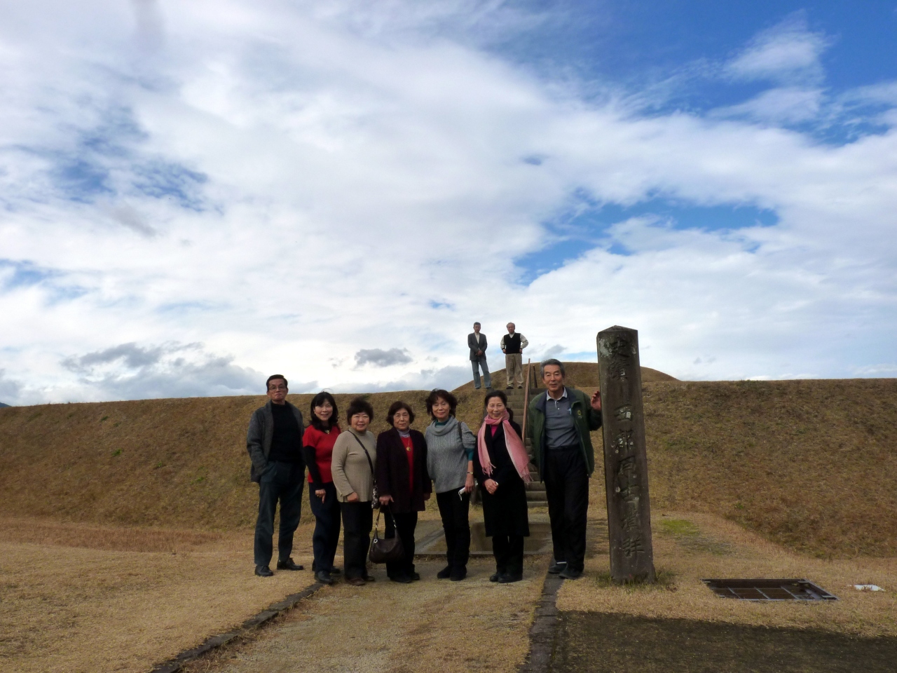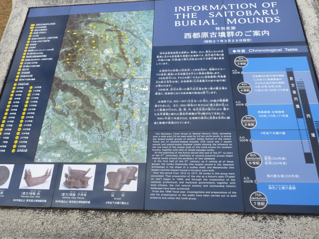 東西3キロメートル、南北4キロメートル、標高70メートルの丘に特別史跡サイト古墳群がある。平坦な台地に7世紀に築造されたと推定される300有余のさまざまな形をした古墳の姿は圧巻。春には菜の花、秋にはコスモス畑も見もの