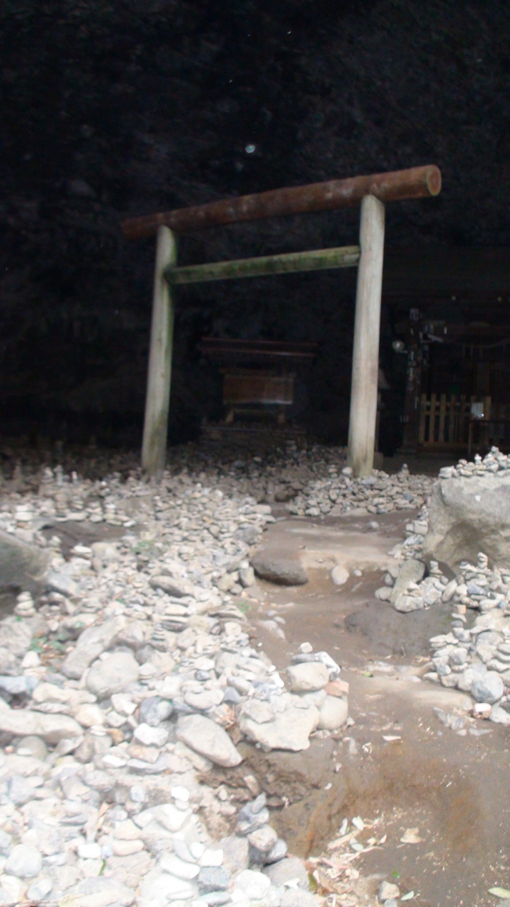 バスセンターから8.4キロメートル。天岩戸神社から西本宮から岩戸川に沿って徒歩で焼く10分ほど下ってゆく。天照大神が岩戸隠れのために天地暗黒となり、諸神がこの河原に集まり神議された場所といわれている洞窟があり、其の神秘さはなるほどとうなずける。