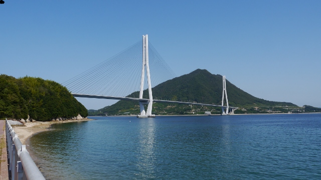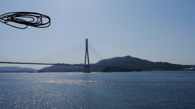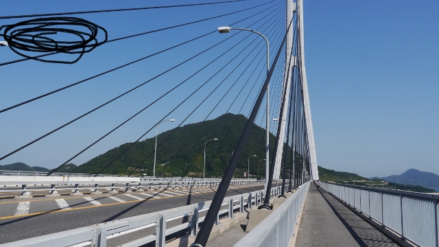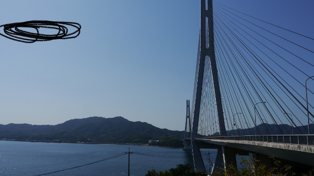 多々羅大橋はしまなみ海道を構成する橋の一つで、大三島と生口島を結ぶ橋である。愛媛県と広島県の県境を通り、今治から進んだしまなみ海道サイクリングもここまでくるとだいぶ進んだという実感が出てくる。全長1480mで長さもあり、斜張橋としては日本最長とのことで遠くから見ればその形状が美しく、近くから見ると迫力を感じる橋だった。