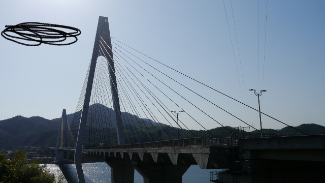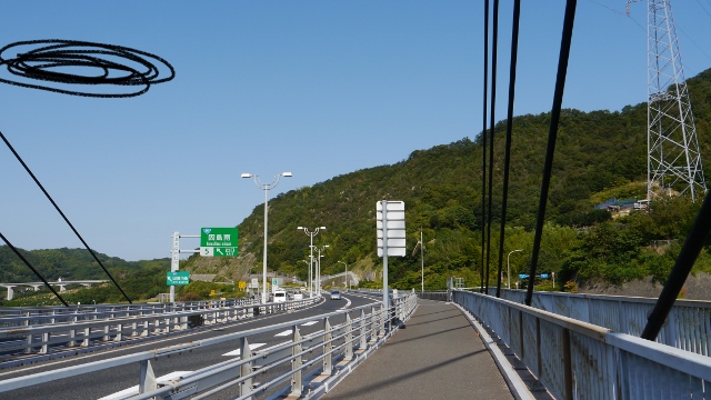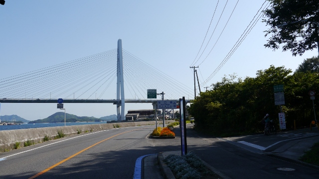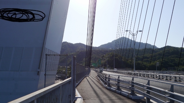 生口橋はしまなみ海道を構成する橋の一つで、広島県の生口島と因島を結ぶ橋である。全長790mの斜張橋で1991年の完成当時では世界最大の斜張橋だったとのこと。先に渡ってきた多々羅大橋と構造が同様だが、長さは生口橋の2倍近い。生口橋の建設技術がいかされ、この橋があったからこそ誕生した橋ともいえる。