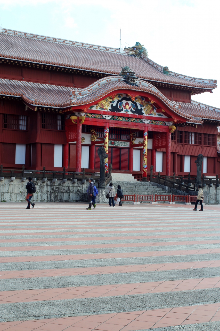 御庭は、首里城の正殿、南殿・番所、北殿、奉神門の建物によって囲まれた中庭広場です。ここでは、元旦の儀式や中国からの使者を迎える儀式などが行われたそうです。重要な儀式は正殿内ではなく屋外でとりおこなわれたのですね。御庭には赤と白の二色の瓦が敷きつめられており、この色違いの列は所官が位の順で並ぶ目印となっていたそうです。見た目も綺麗で合理的な造りですね。また、中央の道は「浮道」と言われ国王や冊封使など限られた人しか通れなかったそうです。