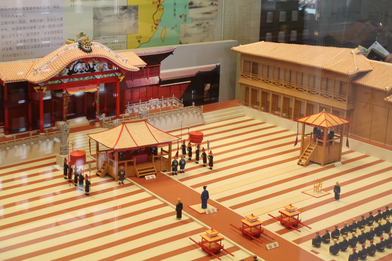 首里城正殿に向かって左側の赤い建物が北殿です。琉球王府の中央行政庁としての機能があったそうです。また日本風の南殿と異なり、中国風で中国からの使者の接待場所でもあったようです。現在は展示スペースになっており色々な模型があり昔の儀式の様子が良く分かります。