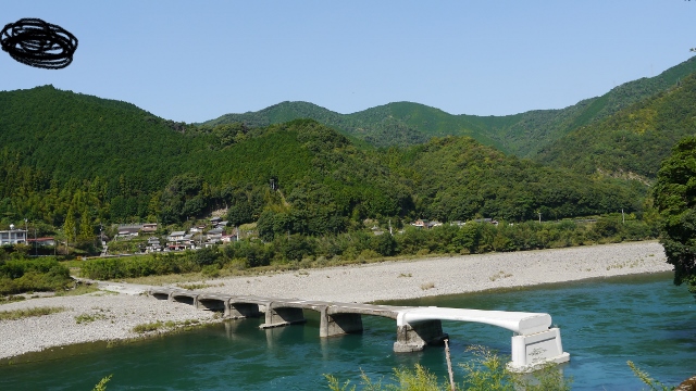 四万十川サイクリングで通る沈下橋の一つ。岩間沈下橋からは約7kmのところに位置する。当地を訪れたのが直近の2013年10月を含めて3回。初めて訪れた2009年12月時点ではきちんと渡れる橋だったが、以降災害のためか橋が欠けていて復旧作業中だった。これを投稿している2015年1月時点では復旧しているようだ。