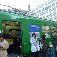広場があり、ハチ公のまわりと、緑色の電車の2箇所に別れて人がいました。