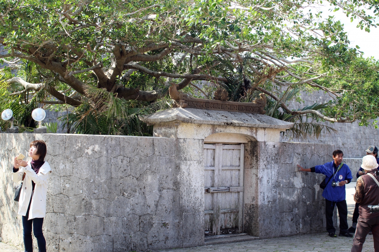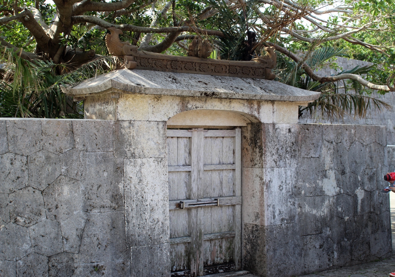 首里森御嶽は首里城下之御庭の城壁の手前にある礼拝所です。琉球開闢神話によれば、神が造られた聖地であるとされています。また城内にはここを含めて「十嶽」と呼ばれる10ヶ所の礼拝所があったそうです。園比屋武御嶽石門を小さくした様な形です。