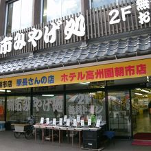朝市通りにある大きなお土産屋さんです。店頭の両端に置かれている大きな駅長さんの人形が目印になっています。
