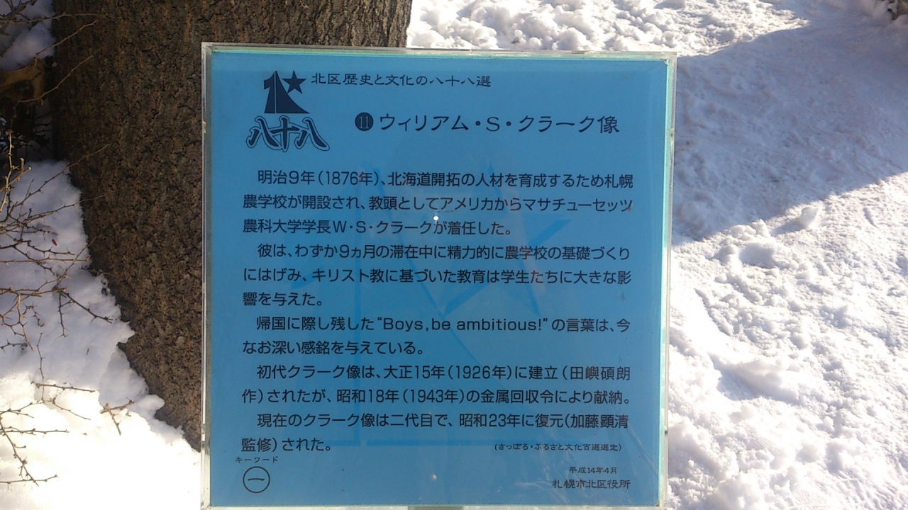 北海道大学構内の古河記念講堂前に設置されているクラーク像は、羊ヶ丘展望台をはじめとする市内数か所に所在するクラーク像の中で最も古い青銅像だと云われています。
