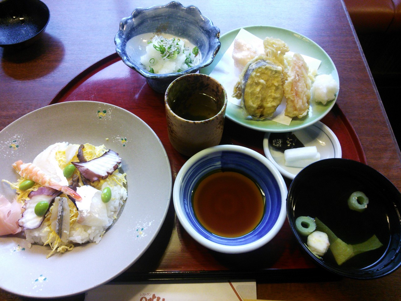 和洋ジャンルを問わず多彩なメニューがあり、勿論、観光客向けに対するご当地モノのメニューもあります。2014年12月の四国旅行の際、お昼ご飯の際に利用し、松山鮨、天ぷら、小鉢、吸い物、お新香がセットになった「いよ媛御膳」(1630円)というセットメニューを注文しました。天ぷらに関してはカラッと揚がっていて、茄子、人参、穴子、キスと具材もそれなりにありましたが、松山鮨に関しては具に蛸、海老、さより等と新鮮な魚が使われていますが、ご飯、具の量ともに多少物足りなさを感じました。またその際に出された小鉢もちりめんじゃこを大根おろしで和えたもので、もう少し違うものが出す事が出来なかったものかと思いました。