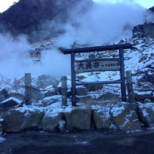 ロープウェイ大涌谷駅からたまご館の前を通り、入口から300メートルくらいの道のりです。300メートル歩いた先には、蒸気がもくもくあがっている場所に辿りつきました。4万年前から今の地形になっているそうです。この日は富士山もはっきり見え最高の景観でした。