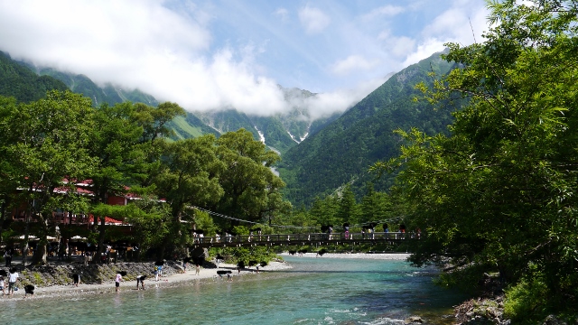 上高地の景勝ポイントの一つである河童橋。梓川の清流に架かるこの橋からは北アルプスの山々を望み大変きれいな景色だと感じた。上高地の中心的な場所ともいうべきなのか観光客が非常にたくさん集まる場所で混雑していた。バスターミナルや駐車場からも近くアクセスしやすい。