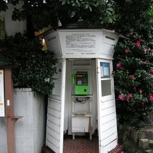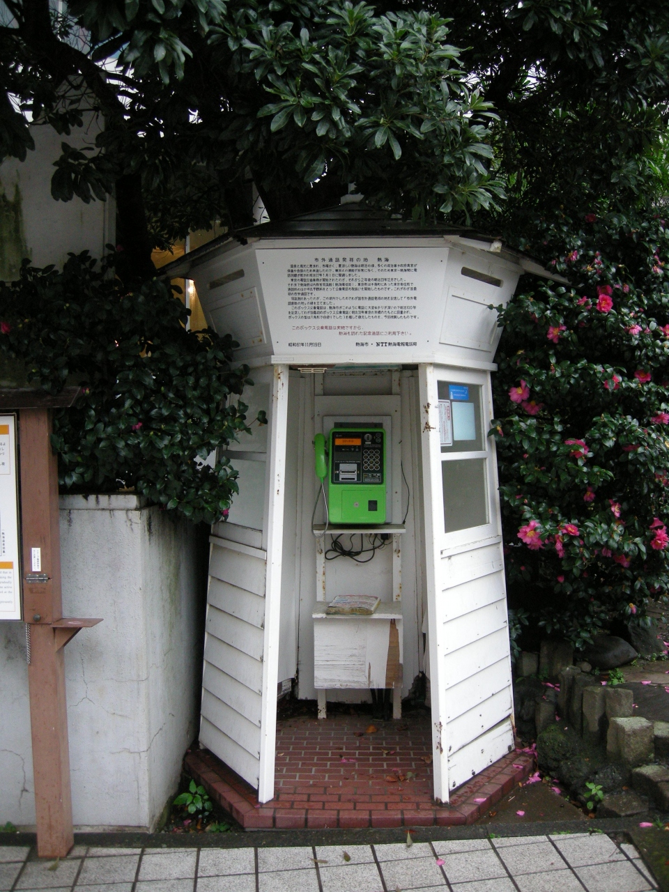 大湯間歇泉のとなりにひっそりとあります。昔は熱海には東京から政府の要人たちが頻繁に訪れていたので電話が必要だったようです。白く塗られた木造の電話ボックスがあってその中に緑の公衆電話が設置されています。日本で最後の公衆電話になるまでここに設置していたもらいたいですね。