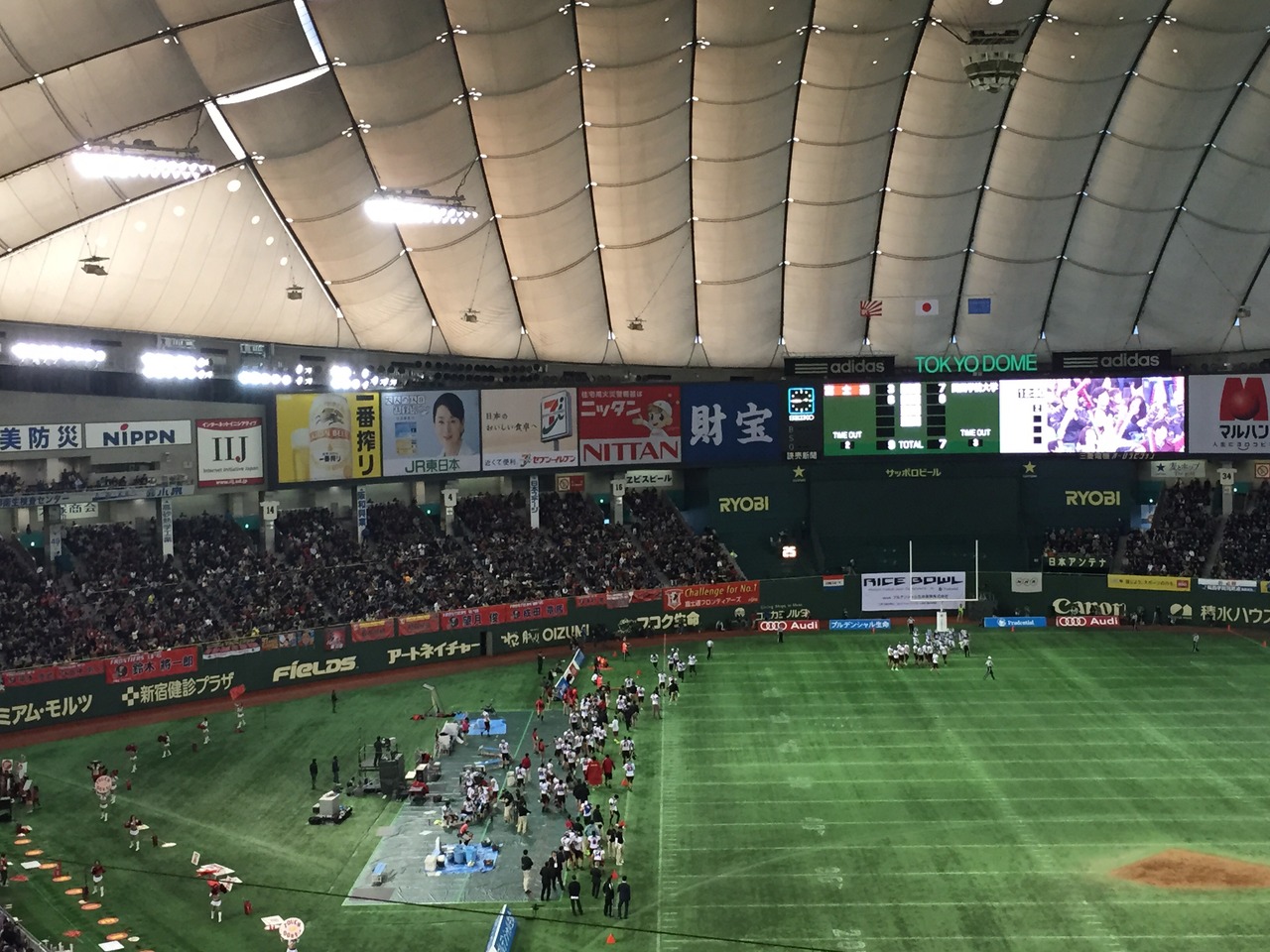 野球観戦、コンサートでおなじみですが、なんと今年の初東京ドーム初アメフト観戦でした!到着が遅れたこともあり、バックネット裏3階という野球ならまあまあの席だけどアメフトにはちょっとという座席に。それでも電光表示と解説がわかりやすく楽しめました