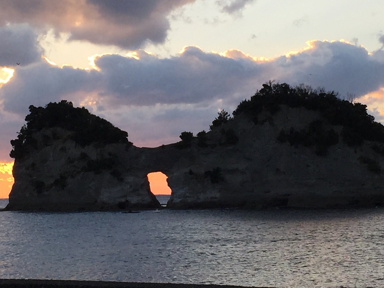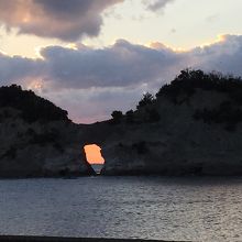 中央の穴に沈む夕日をとらえたいのでしょうが、上空は良い感じにオレンジ色に染まっているのに、水平線近くは雲があって、なかなかぴったりと日没を写真に収めるのは難しそうでした。