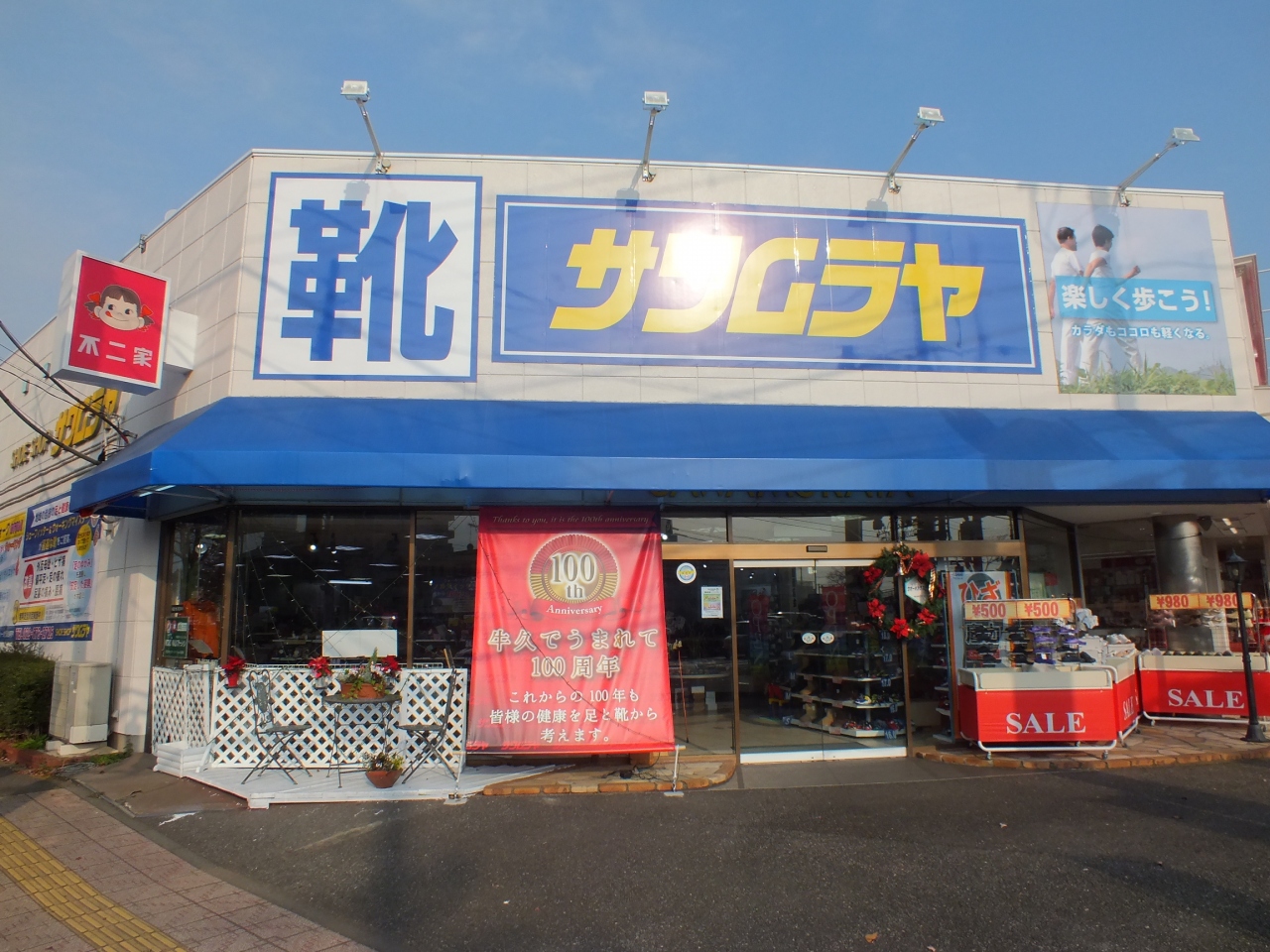 店の前には「牛久でうまれて100周年」の表示がありました。大規模靴店舗全盛の現在にもいても生き残っているというのは、よほど地元の方から愛されているからだと思います。こんなお店が近くにあると嬉しいと思います。