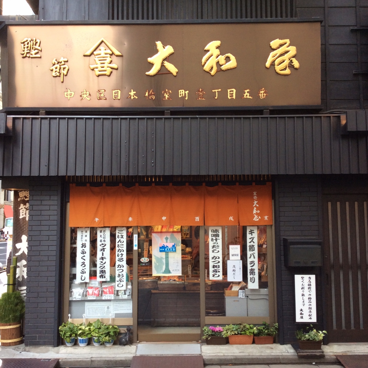 日本橋三越本店の新館の道を挟んで前にあります。鰹節の専門店で使用してるのは本枯れ節で、自社工場で毎日削り店頭に出しているので削りたての物が頂けるのがいいです。鰹節の激戦区なので隣接2社と比べてみてお好みのものを探してください。