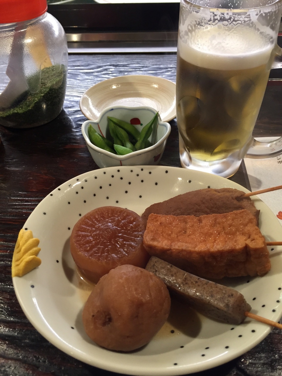 2回目の訪問です。比較的お店の少ない南口ですが、おでん屋さんはちらほら。有名店もあります。そんな南口で見つけた素朴のおでん屋さん。ビールの安さに惹かれました。名物黒おでんも素朴な味ですがパクパク進みます。焼き鳥も美味です。