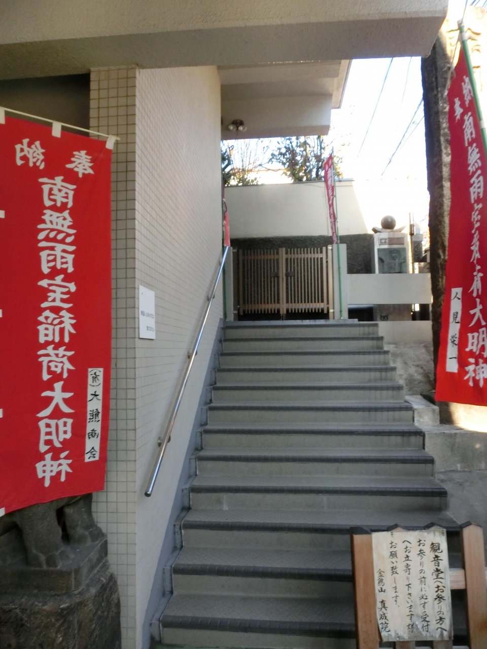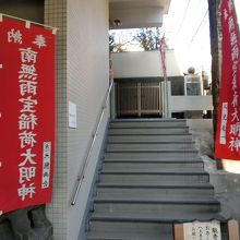 大きな赤い幟がはためいていて、あまりお寺という気がしない。