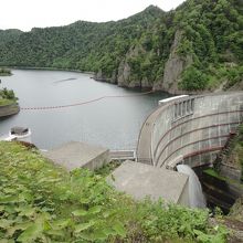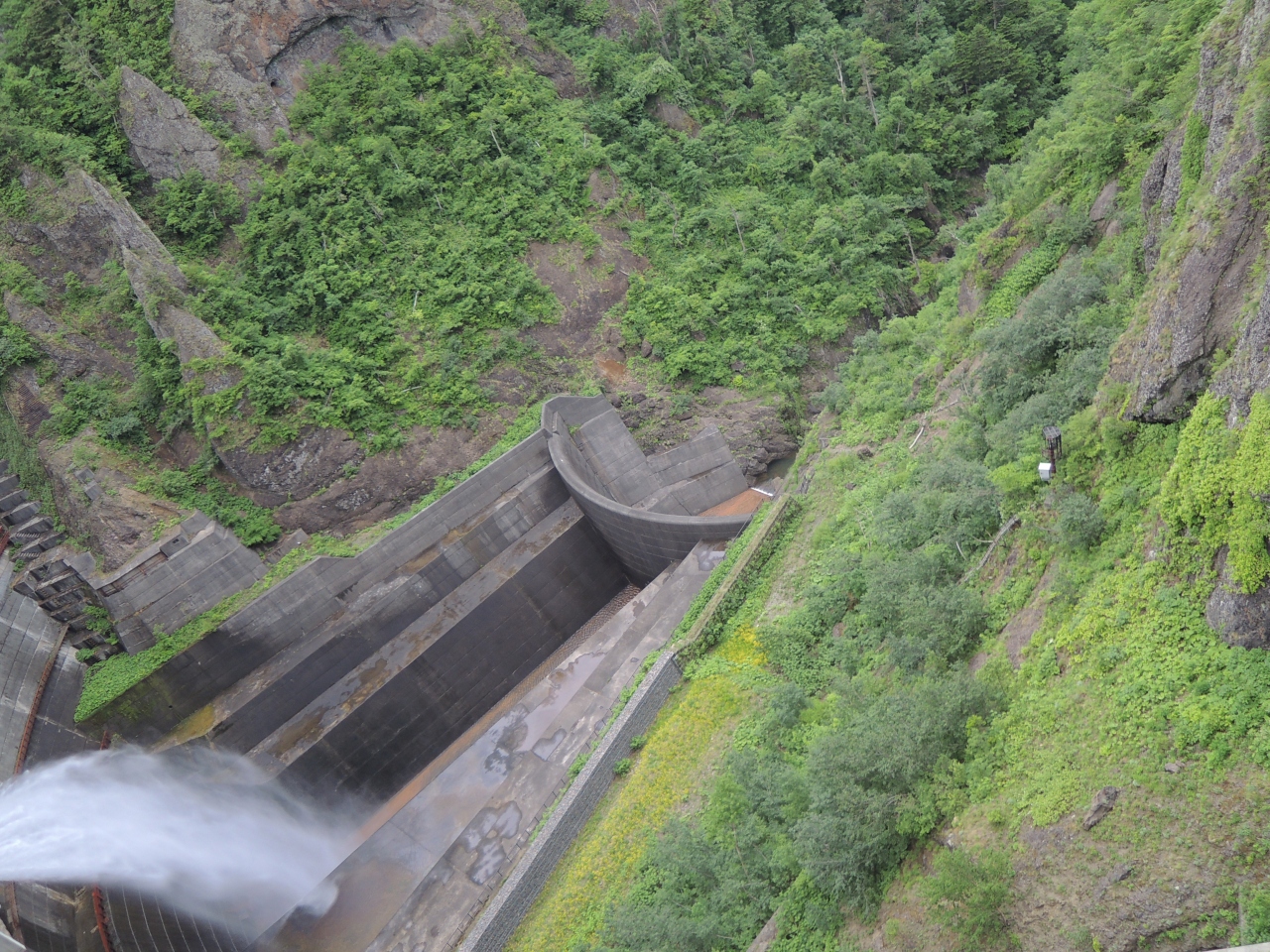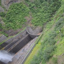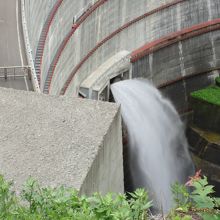 ダムの放水は勢いがあります。周りは緑に囲まれていてダムと緑の景観が良い所でした。