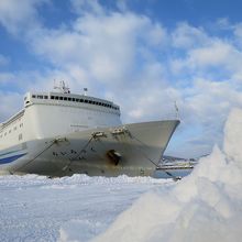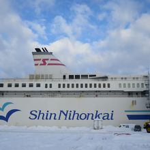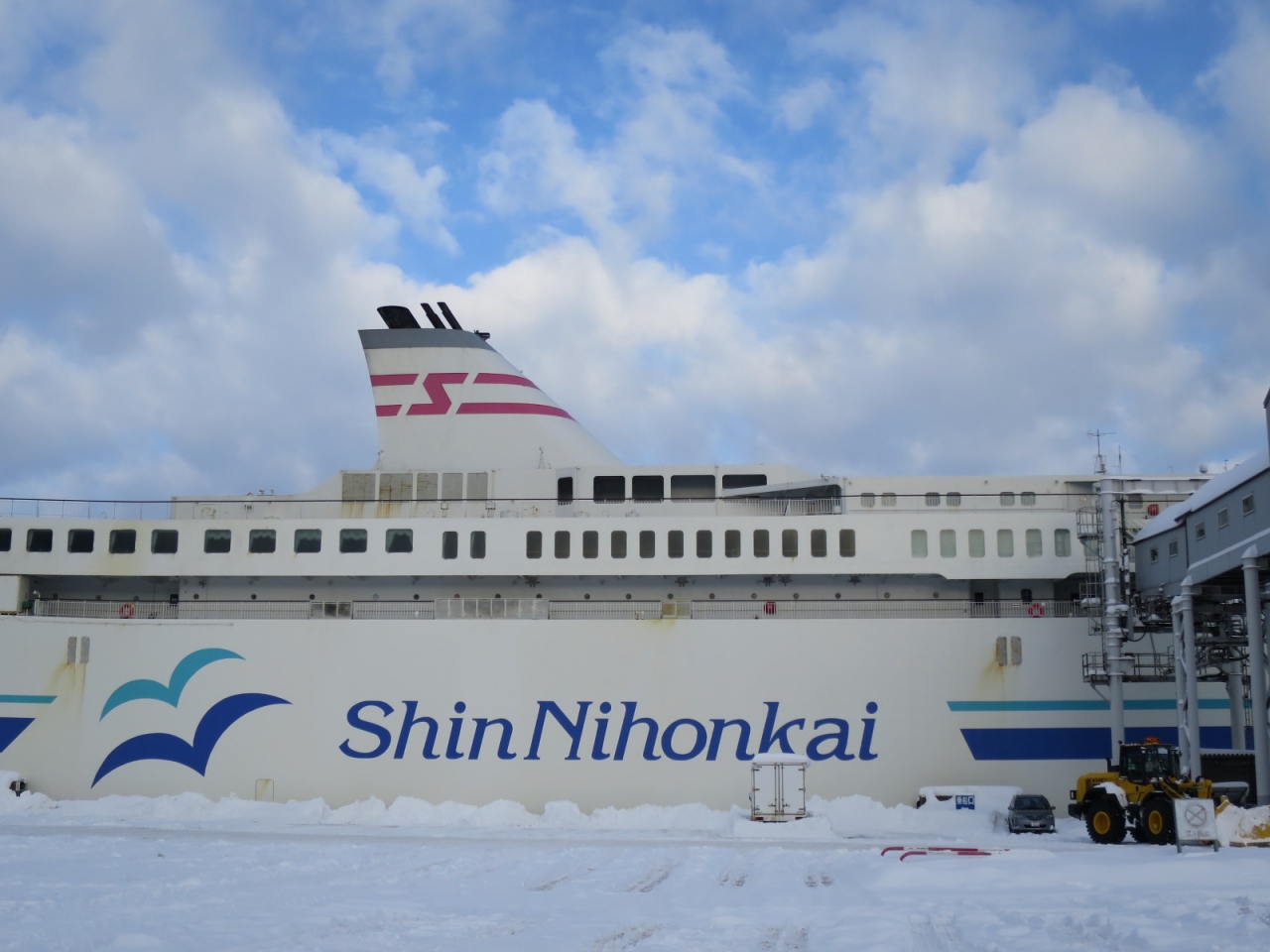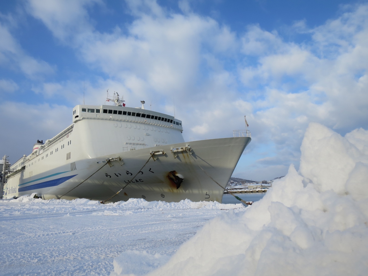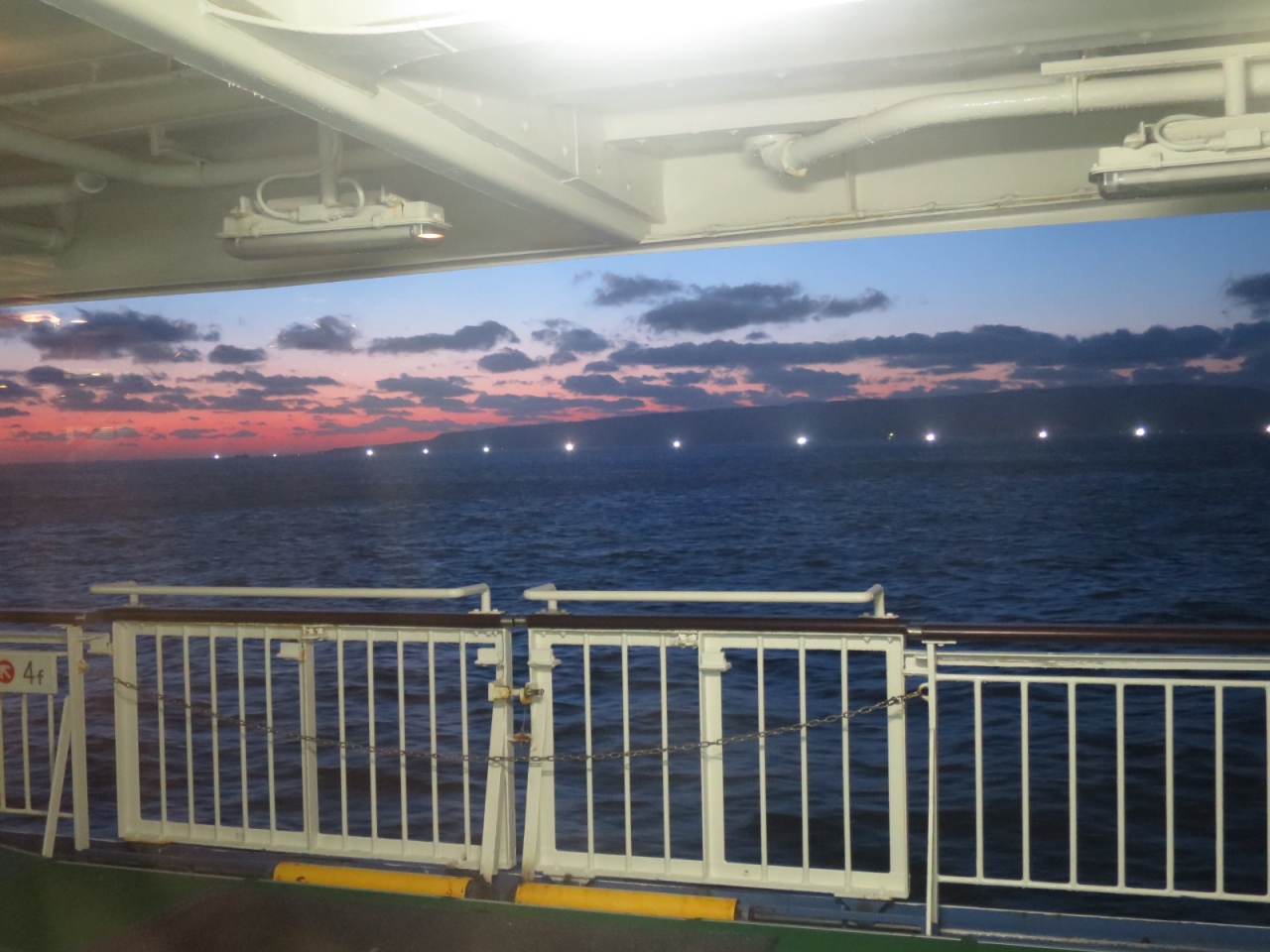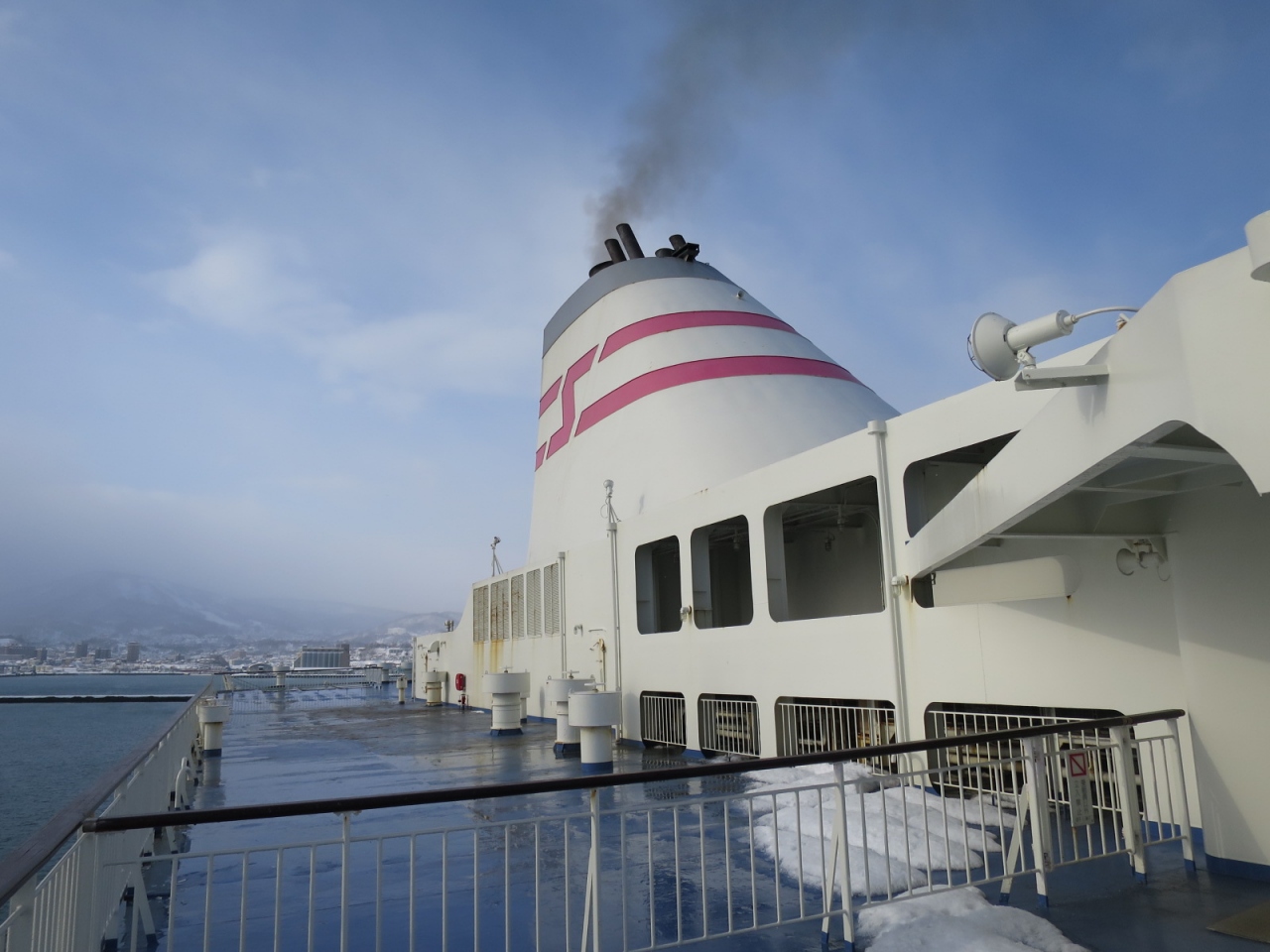 利用したのが、冬だったので甲板に出られるのは出港の時のみ。夏であれば、津軽海峡西口沖ですれ違う反対方向の便も、風にあたりながら眺められたと思います。すれ違いでの相手の船は、まるで洋上の御殿のように明りがこうこうと輝いてきれいでした。