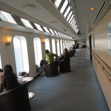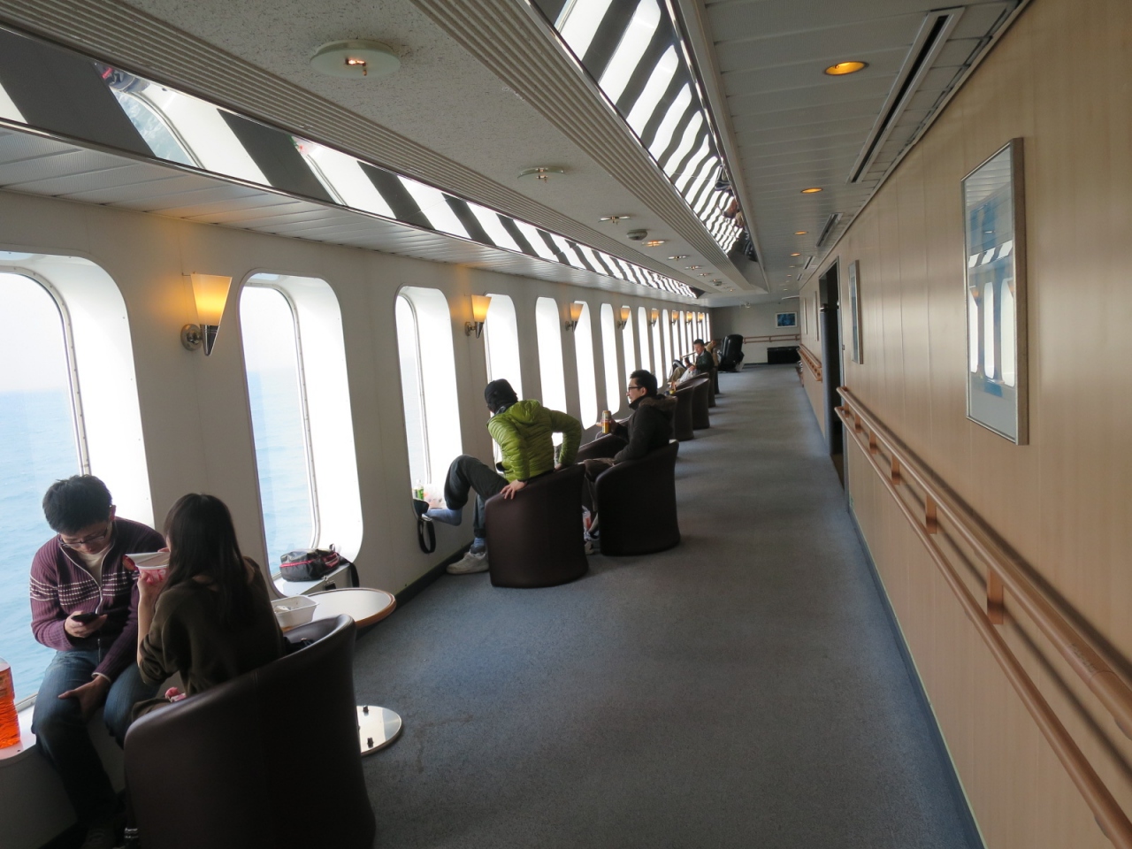 また、冬(10月~4月中旬)の場合は、前方のフォワードサロンもブラインドが下ろされ、進行方向前方を眺めることはできませんでした。フォワードサロンはソファーが備えられた船の前方にある共用の休憩室。3階が喫煙用で4階が禁煙用と、2ヶ所ありました(22時までの利用)。