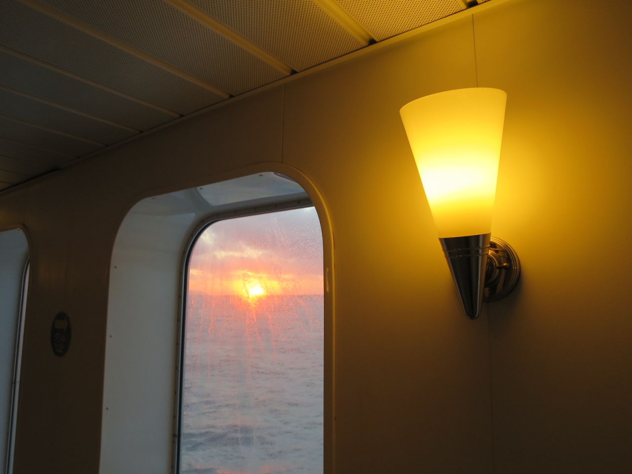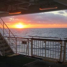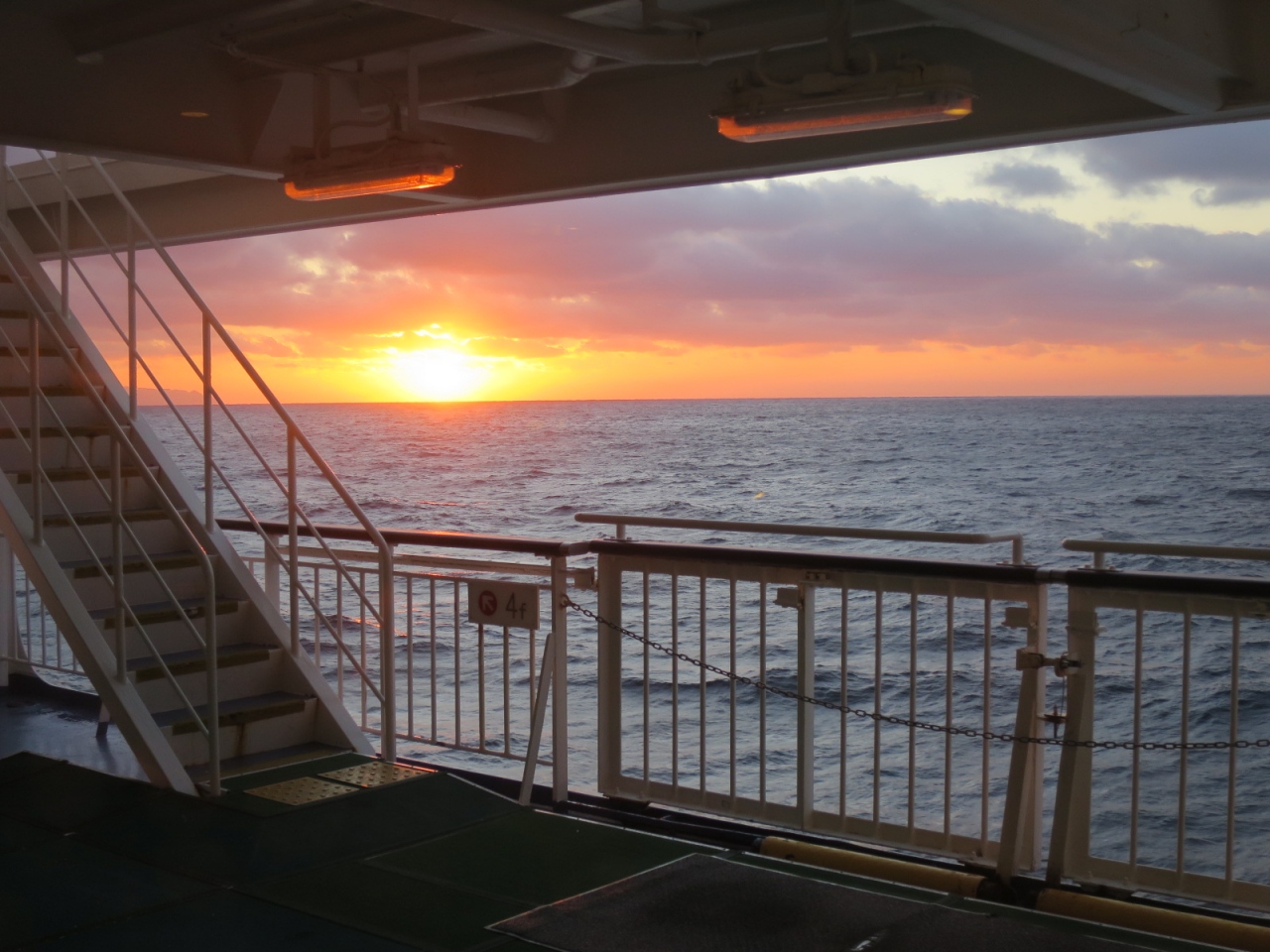 船は小樽から新潟の陸伝いを行きます。途中、観光船ほど近くには寄りませんが、小樽の赤岩海岸、ちょこんと立つ様子が見える積丹半島・神威岬の神威岩、そして奥尻島のあたりでちょうど日没を迎えました。進行方向右側の男湯となりますが、窓から見える日本海に沈む夕日は最高です。奥尻島の島影の横にゆっくりと沈む様子を、波立つ湯船に浸かってのんびりと眺めていました。ただ、お湯はちょっと塩素くさかったです。