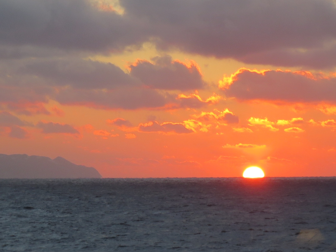 男湯からは奥尻島横に沈む日本海の夕日(小樽→新潟)
