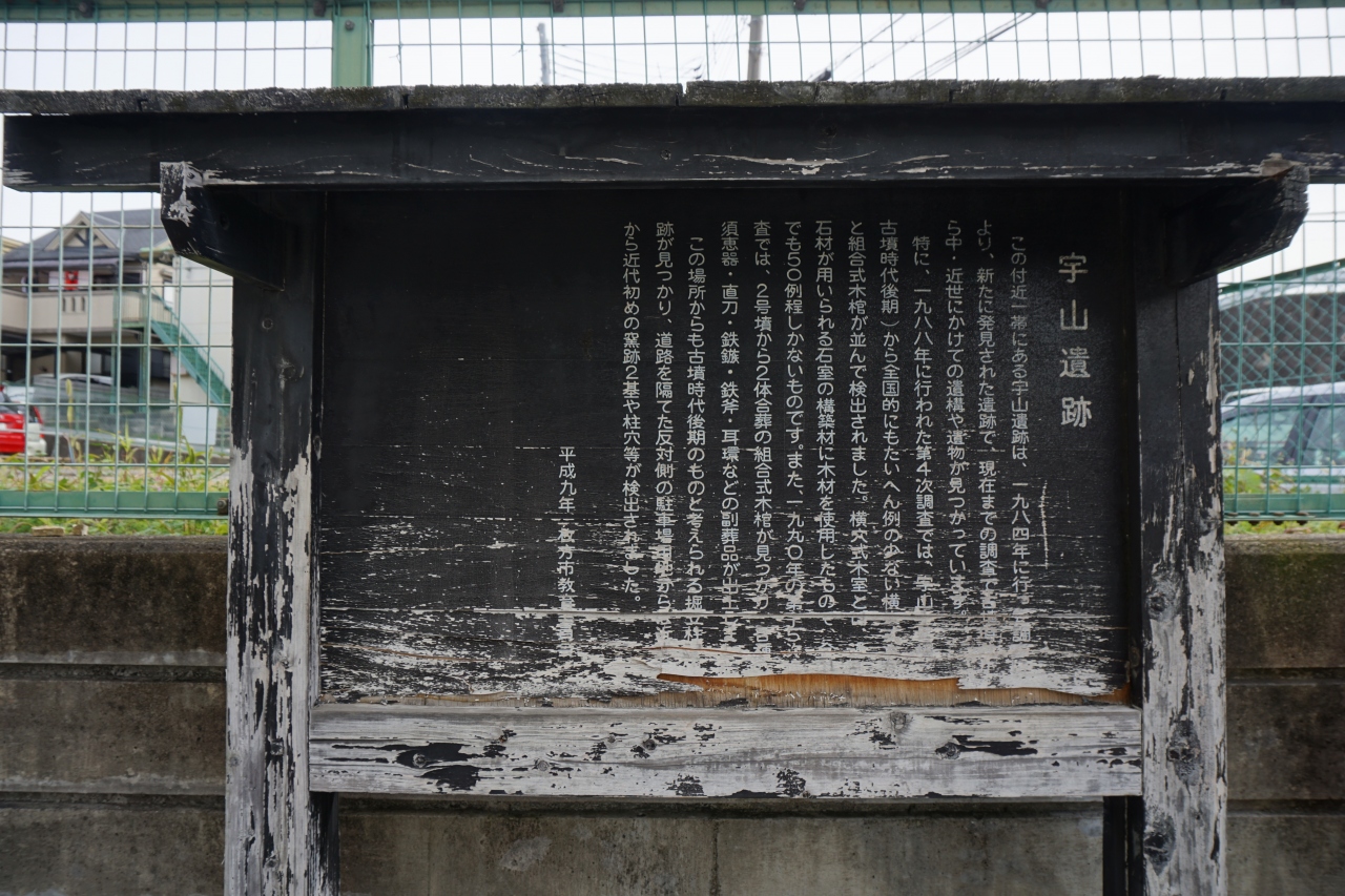 宇山遺跡は、牧野公園のそば。公民館の敷地の中に古ぼっけた遺跡の説明板が建っていました。古墳時代の遺跡なんでしょうが、枚方の辺りは、仁徳天皇が大規模な土木工事をしたという地域。早くから開けていた場所であることを示すものだと思います。