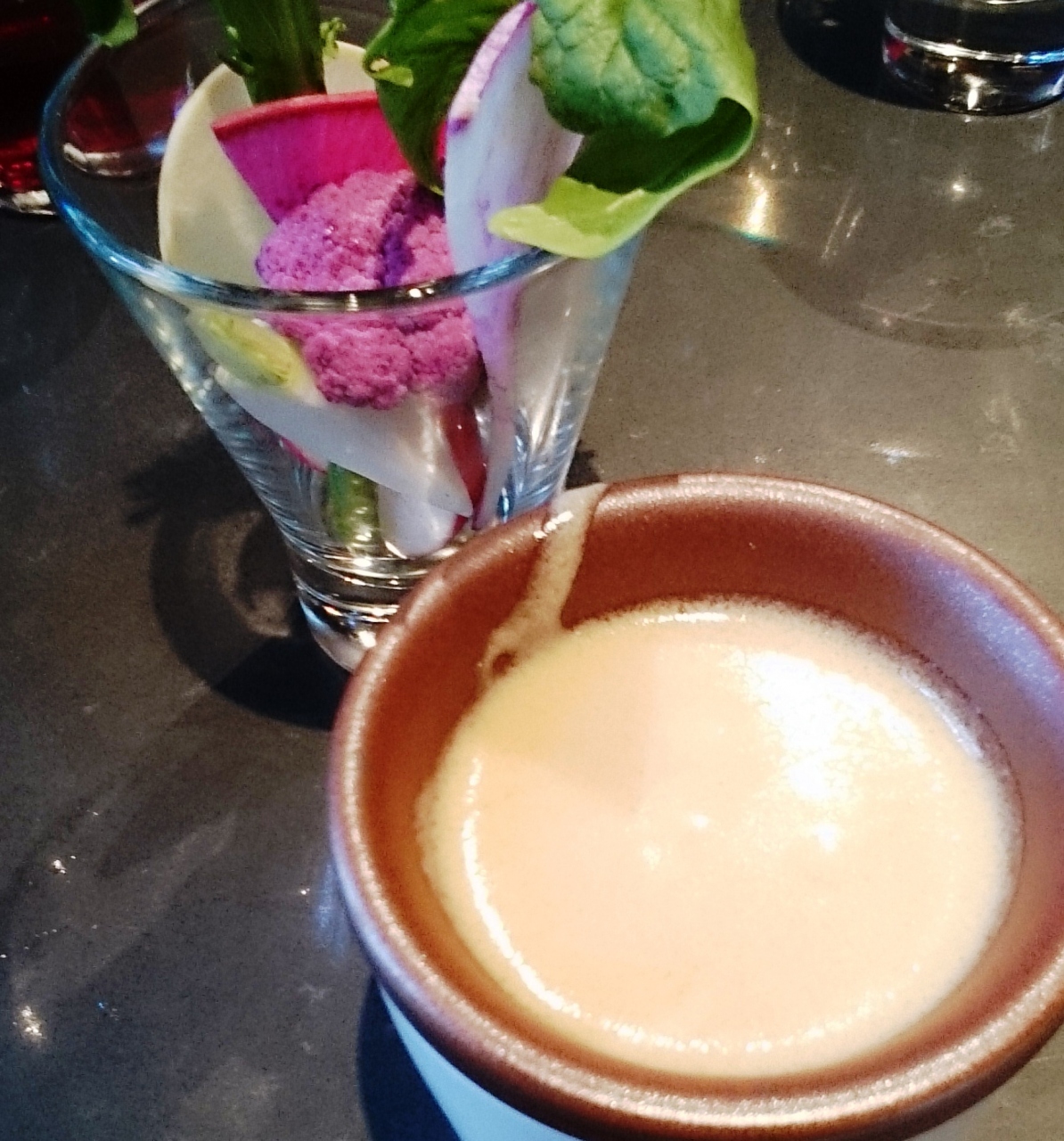こちらのお店の売りはなんといってもお野菜だと思います。冬なので葉物より赤カブとか大根とかにんじんとかそういったものが多い気がしました。どれも野菜の味がしっかりしていて、カブとか生野菜でたべることはないので、新鮮でぱりっとした食感でバーチャカウダとからめて食べるととてもおいしかったです。