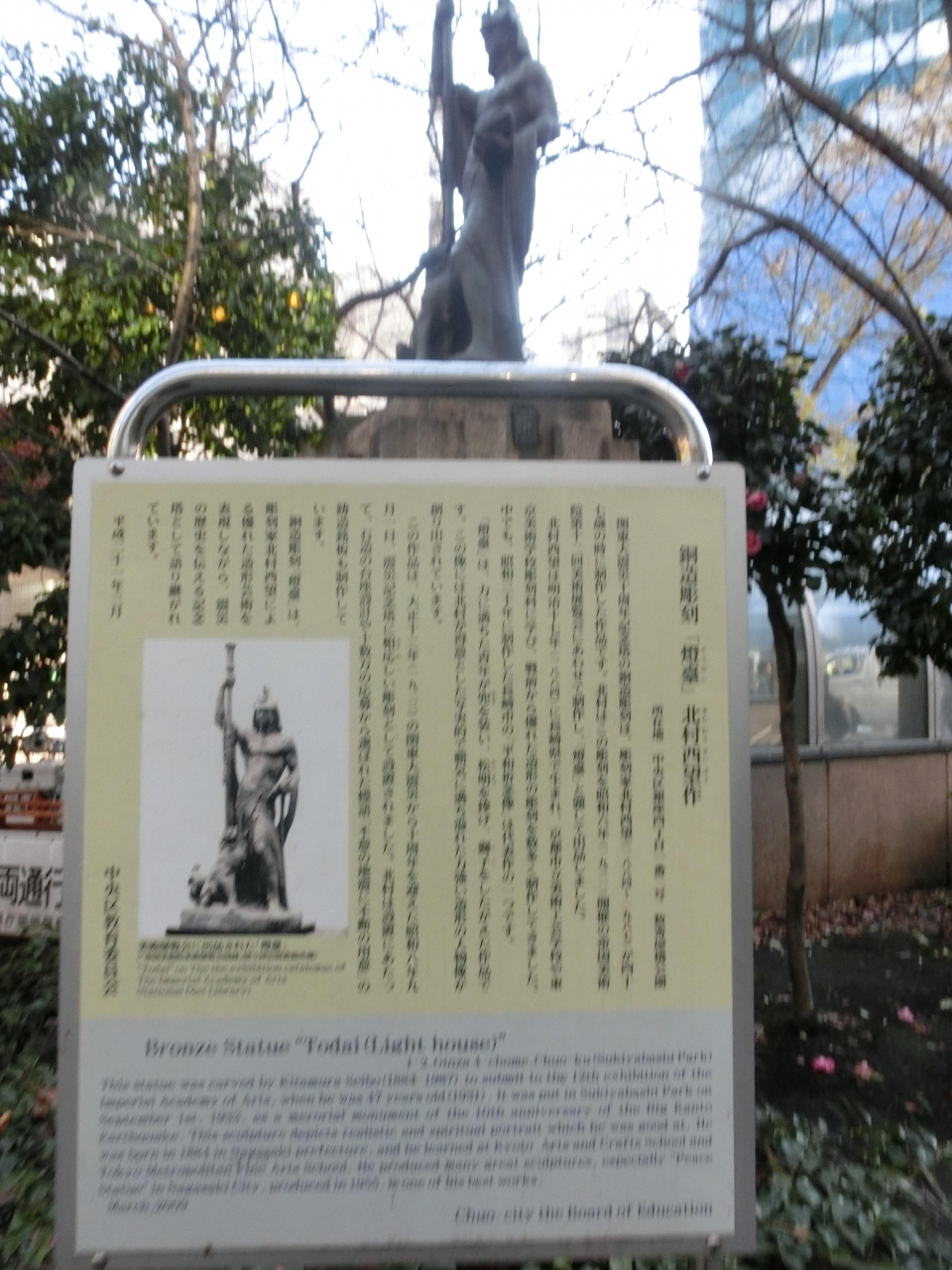 「燈臺」と題された銅像は、昭和6年に彫刻家北村西望(1884~1987)が制作、関東大震災10周年記念塔として、震災の歴史を記憶にとどめてきた。