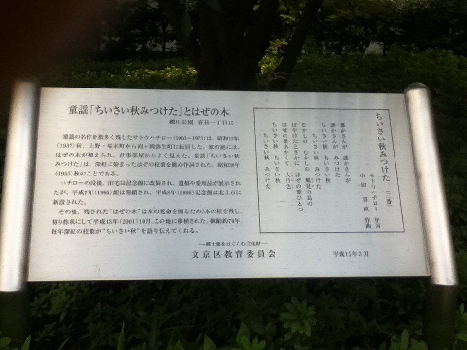 地下鉄後楽園駅のすぐ横の礫川公園の南側の植栽近くに、こちらの説明板がある。週末午後、公園の北側は遊具があるため子供たちで賑わっていたが、説明板のある南側では、会社員らしい人が数人ベンチでやすんでいるだけで、その横にある説明板を見る人はいなく静かであった。説明板のみなので観光要素は少ないが、サトウハチローが文京区弥生に住んでいて、自宅の庭にあった、深紅に染まったはぜの枝葉を眺め「ちいさい秋みつけた」を作詞したものであり、そのはぜの木が現在の地に移植された。そのような経緯を聞くと、この歌にさらに親しみを感じてしまう。特にサトウハチローやこの界隈に関心や知識がある方には、訪問することをお勧めする。