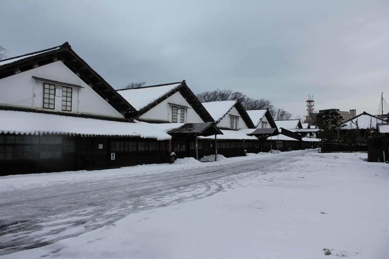 雪のない時期に来たこともありましたが、雪の時期の山居倉庫は白い雪と黒い壁とで