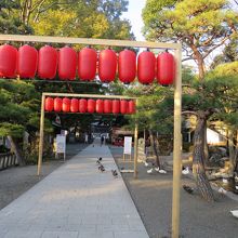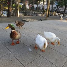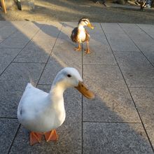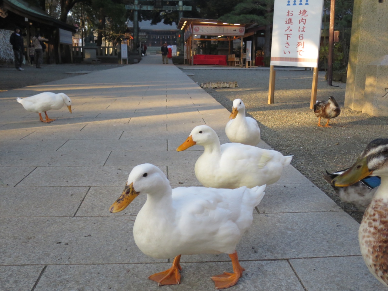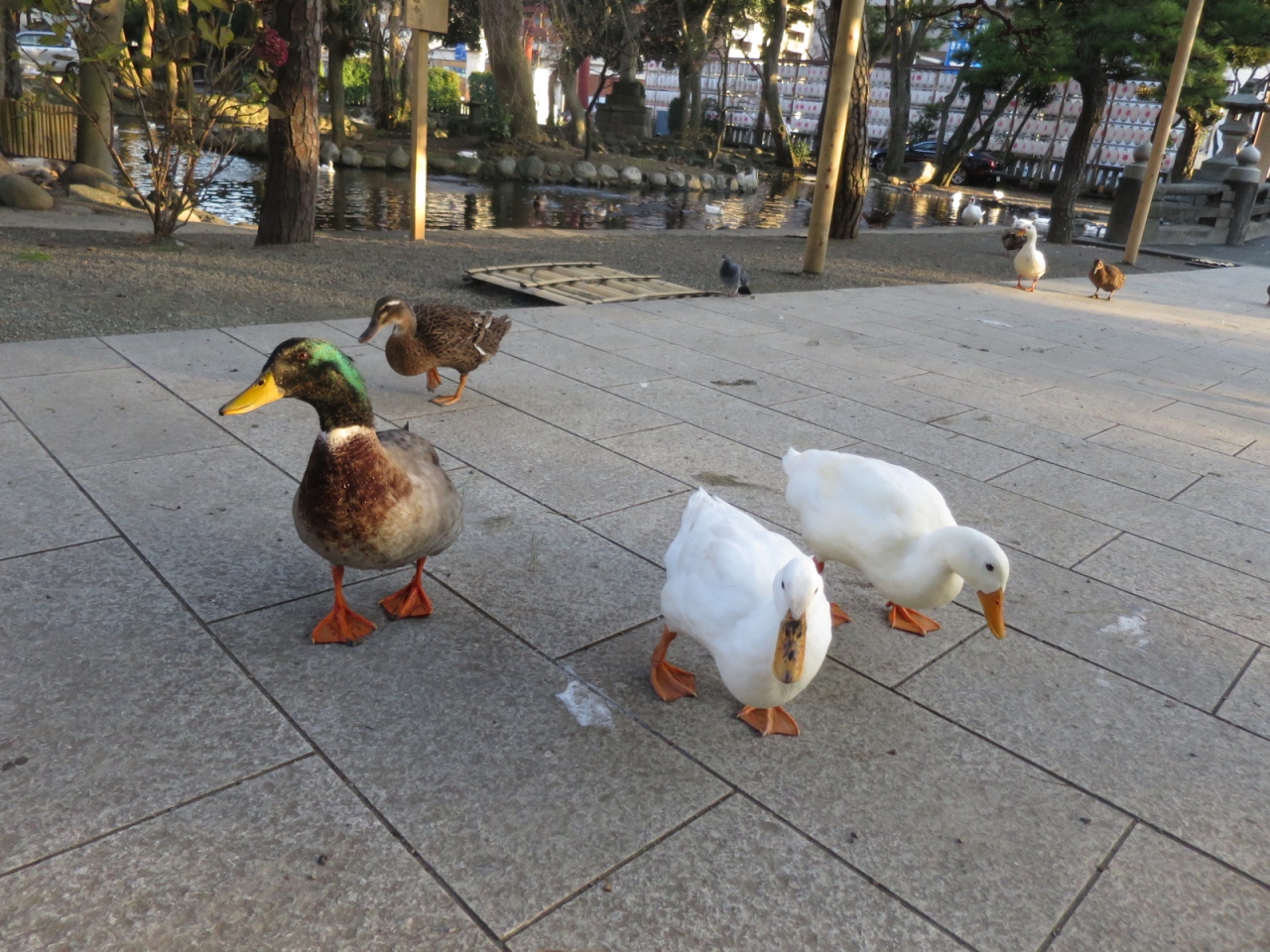 そして、入口の鳥居をくぐると、前庭の神池を泳ぐアヒルが参道に上がってきて出迎えてくれました(エサをねだりにきただけ?)。鳥にご縁のある神社なのでしょうか。