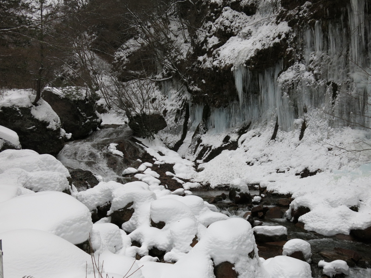 横谷渓谷にある屏風岩。冬、その近辺に大きな「氷瀑」(山から流れ落ちた水が凍ってできた、氷の柱)が出現していました。見事ですよ。雪と氷の白黒の世界と渓谷を流れる水の音色・・・何もかも忘れて冬の世界に浸れます。注:雪深いので、立ち止まると寒いです。
