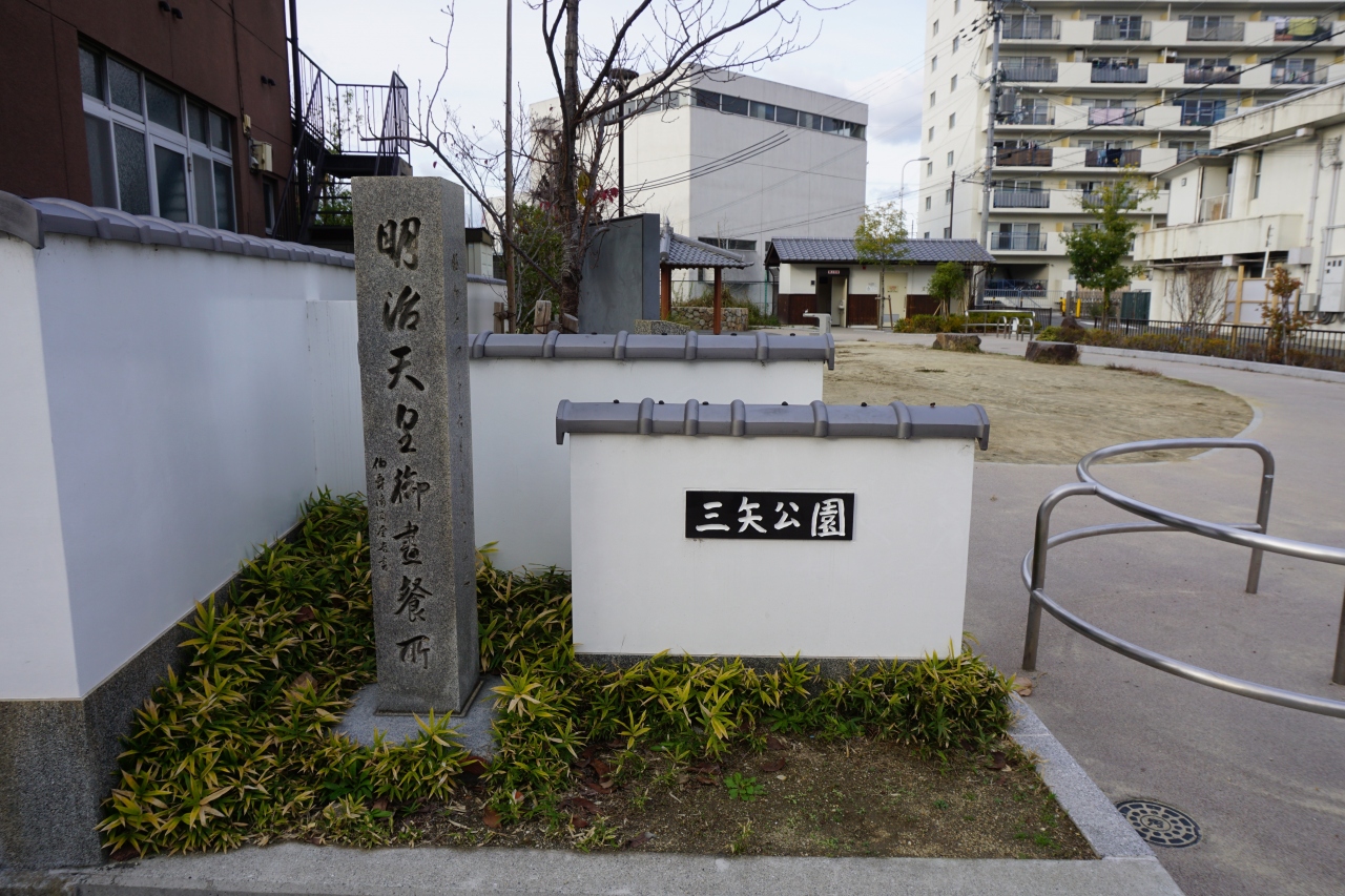 枚方宿の中ほどにある本陣跡。三矢公園という公園になっていて、表には明治天皇がここに来たことを示す石柱が建っていました。宿場にしても、本陣にしても、ある意味で言えば徳川幕府の遺産。そんなことより、明治天皇がここに来たことこそ、大事なことなのであるといった明治政府の空威張りの跡のような気もしてきました。