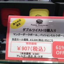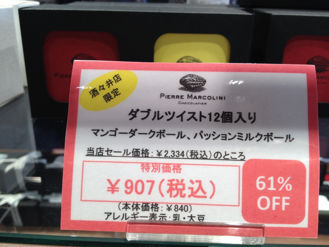 チョコレートで有名なピエール マルコリーニ。こちらではチョコレートが安く手に入ります。酒々井店限定のマンゴーダークボールとパッションミルクボールの入ったダブルツイストのセットは61%OFFで割引率が良かったです。