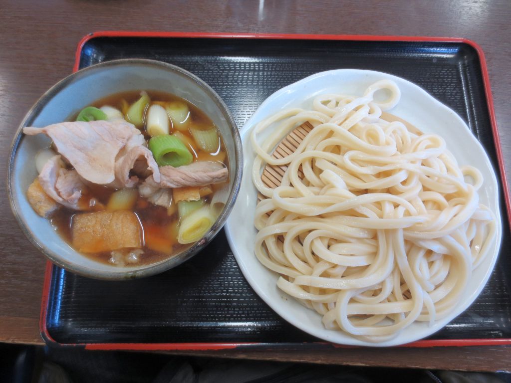 私は肉汁うどん、妻はきのこ汁うどんを頼みましたが、肉汁うどんはたくさんの肉とネギがつけ汁に溢れんばかりに入ってます。このネギでかなりの野菜がとれちゃいますね。