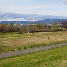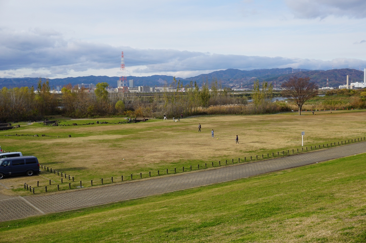 枚方宿から、淀川資料館を越えて、淀川の河川敷に出たところが、淀川河川公園 枚方地区。河川敷を利用して、広々とした運動公園のような公園が整備されていました。サッカーみたいなことをやっている人がいたり、それなりに人影が見えて、やはり、街に近い分、利用はしやすいということなんでしょう。