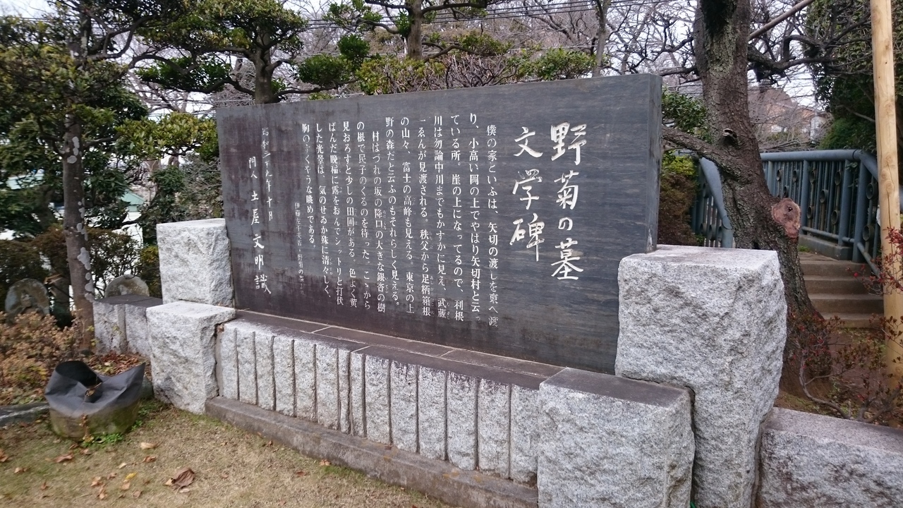 小説「野菊の墓」の舞台になった松戸市に建てられた記念碑です。アクセスの悪い場所にありますが、小説の一節が刻まれた記念碑は高台に建ち、なかなかの絶景。江戸川の向こうにスカイツリーと富士山が綺麗に見えました。