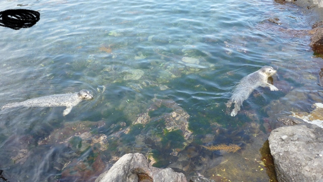 利尻島一周で訪れた観光ポイントの一つ。海岸には独特の岩場が広がり絶景であった。また、山側は晴れていればおそらく利尻富士がきれいにみられると思われるが訪問時は雲の中だった。柵で覆われた水中にはアザラシが遊泳していて近くで見ると意外とかわいらしかった(アザラシは2010年の写真)。