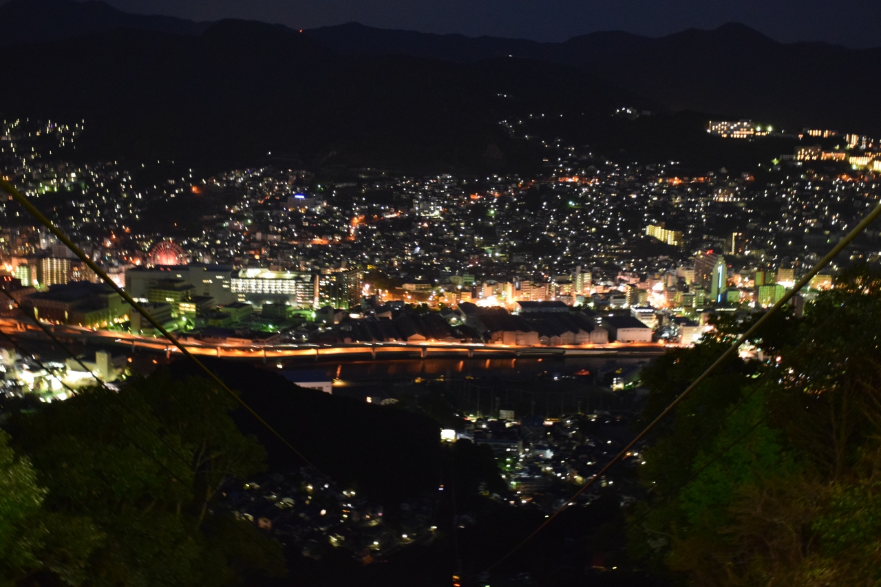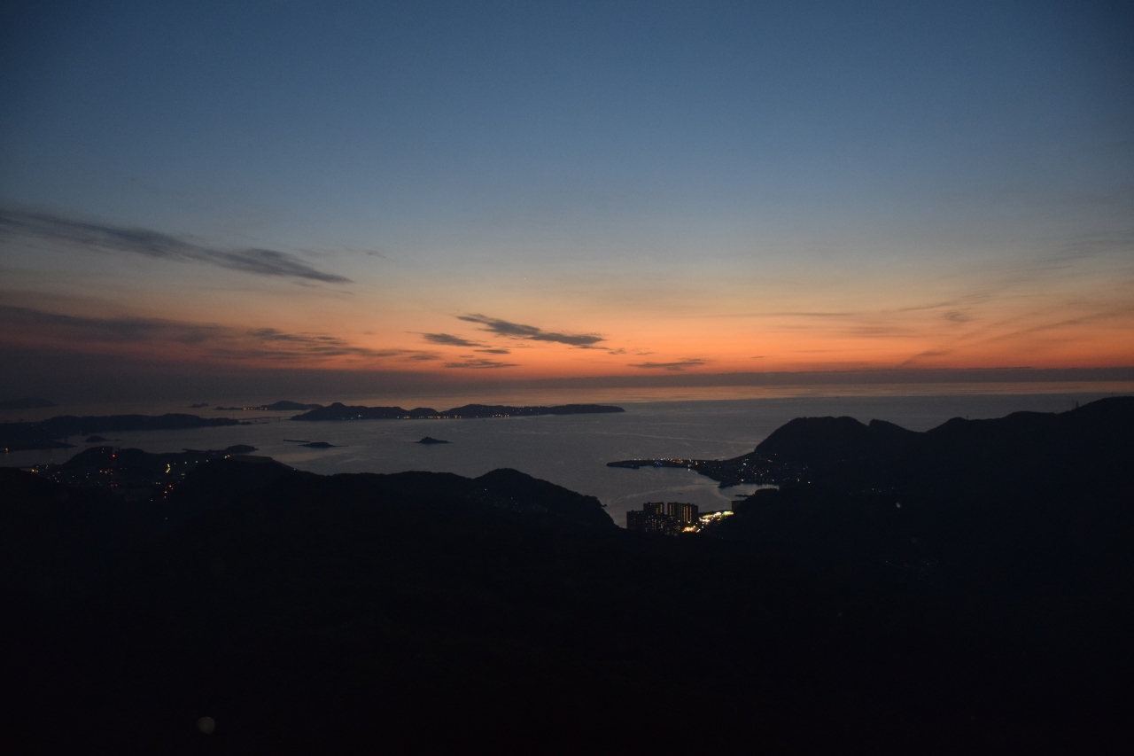 稲佐山ロープウェイを降りて、急な階段を上がり、少し歩くと正面に見えてきます。車でも中腹まで上がると、シャトルバスがあるようです。展望台のすぐそばまでも来ることができます。長崎の夜景は「新世界3大夜景」の一つに数えられています。昼間も景色も市街地を一望できて素晴らしいでょうが、夕暮れから夜にかけては、夕方の景色と夜のとばりが降りてからの景色の二つを楽しめます。西の方を見ると、東シナ海に沈む夕陽も。オレンジ色の海はきれいです。ロープウェイが混むのは覚悟してください。一番上は露天なので、寒さ対策を忘れずに。