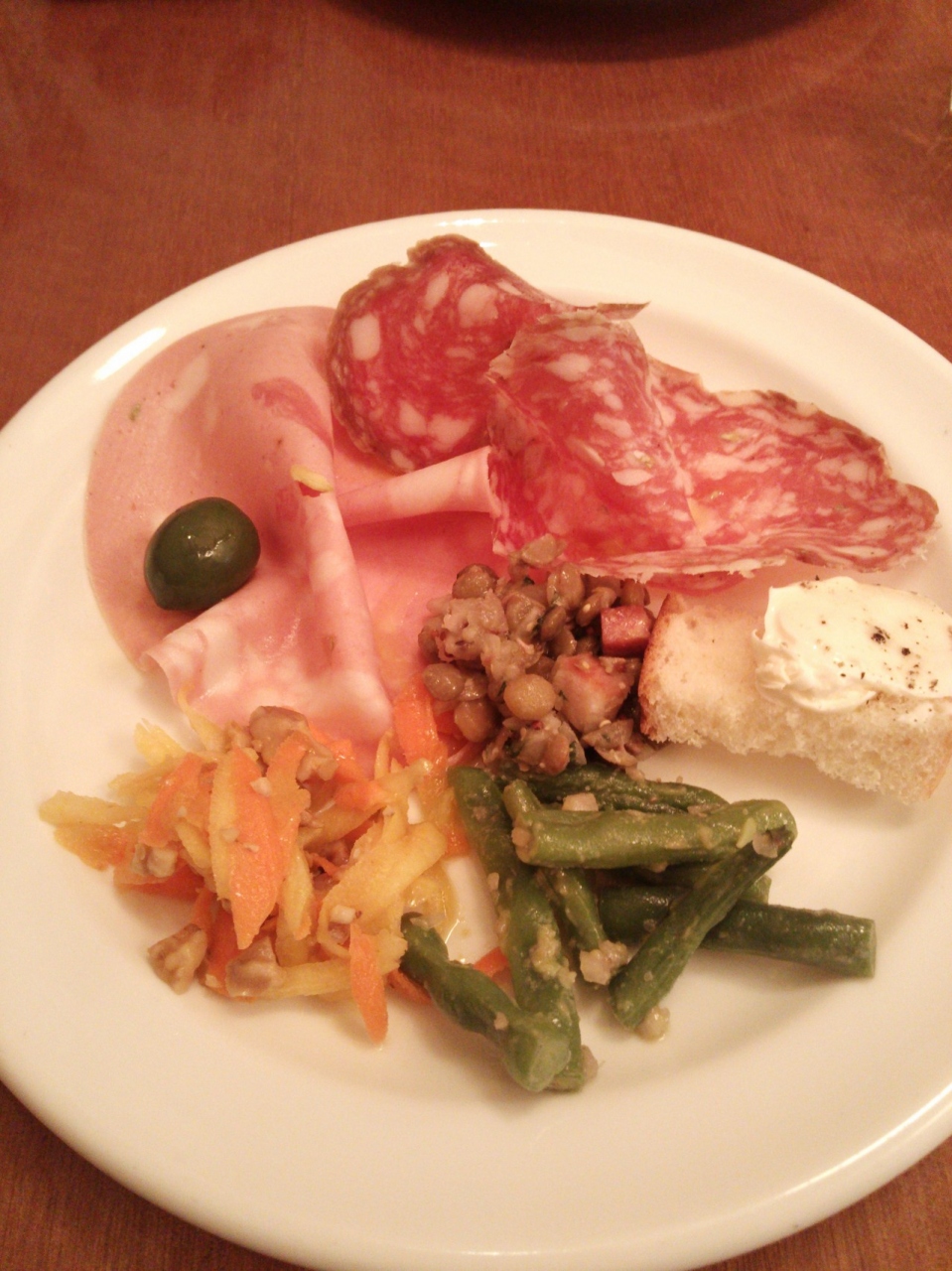 前菜は野菜料理やハム等が種類豊富で満足でした。選べるパスタは、期待したほどでなくごく普通の印象。デザートは付いていなかったので別料金500円でいただきました。